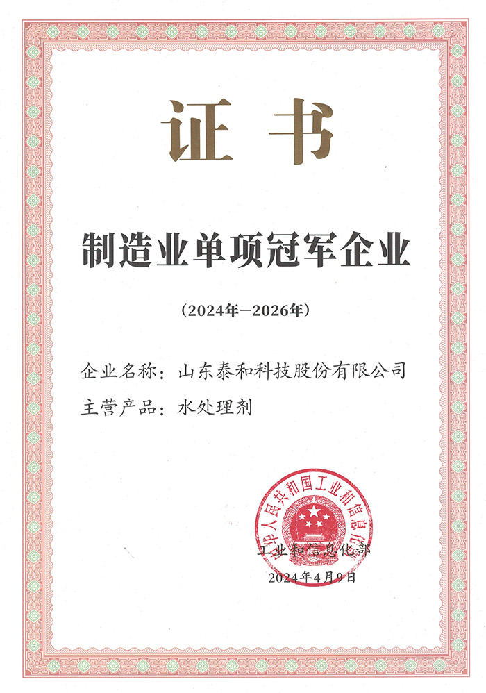 近日,泰和科技領(lǐng)到了國家工業(yè)和信息化部頒發(fā)的“制造業(yè)單項(xiàng)冠軍企業(yè)”證書,代表公司順利通過了復(fù)核。該稱號(hào)的延續(xù)不僅體現(xiàn)了泰和科技在水處理劑制造領(lǐng)域的卓越實(shí)力,也充分展示了公司在市場(chǎng)份額、創(chuàng)新能力、質(zhì)量水平、品牌影響力等方面的顯著優(yōu)勢(shì)。